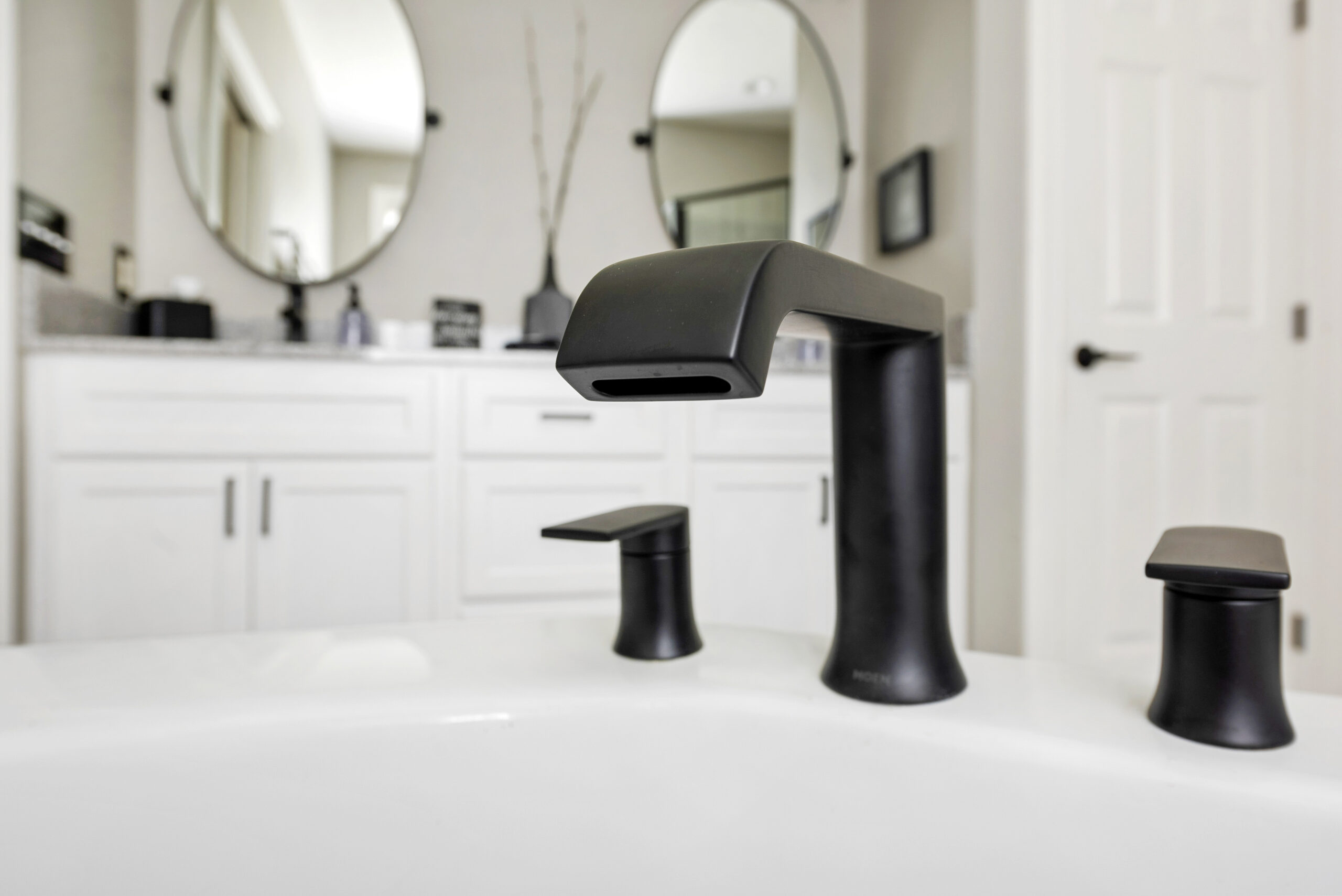 The existing bathroom was defined by worn materials and a design that felt more “builder-basic” than custom. Brass fixtures and hardware gave the room an outdated look, while the large, unframed mirror and plain floor tile did little to add character. The overall style didn’t capture the homeowners’ personality or preferences, leaving them ready for a fresh start. They wanted a space that combined style, functionality, and lasting quality to invoke the feeling of intentionality rather than cookie-cutter.