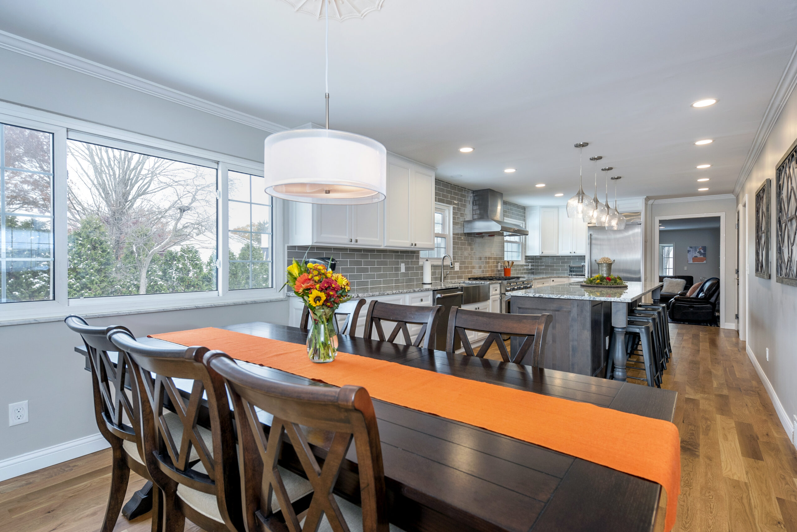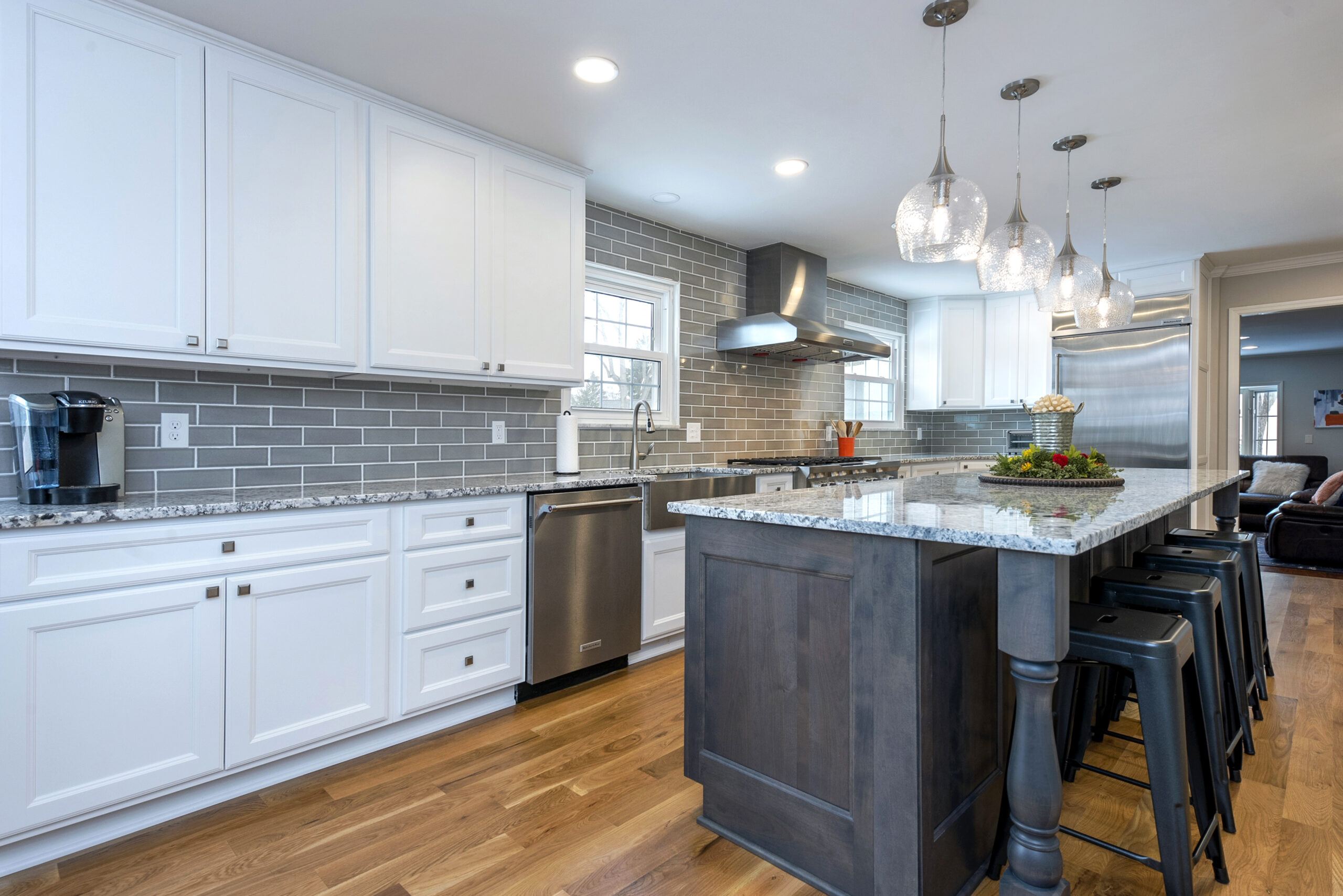 Our goal was simple: brighten and modernize this kitchen! We replaced the cabinets with modern doors and a clean white finish. Granite countertops and a tile backsplash upscaled the kitchen’s look, but the biggest addition was a unique island remodel. We expanded the island to fit bar stools and drawers, turning a thruway into a warmer environment you’d want to stay in.