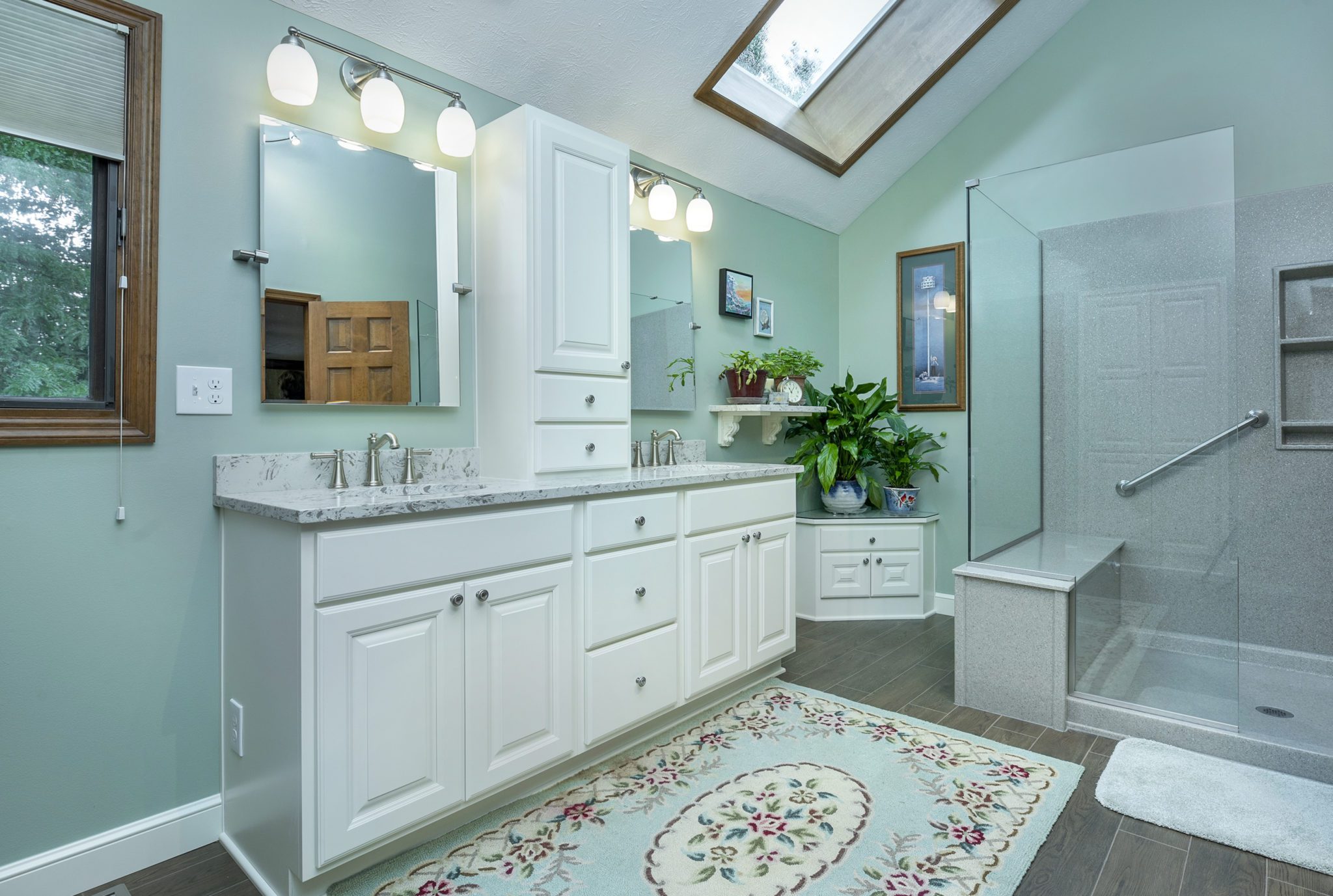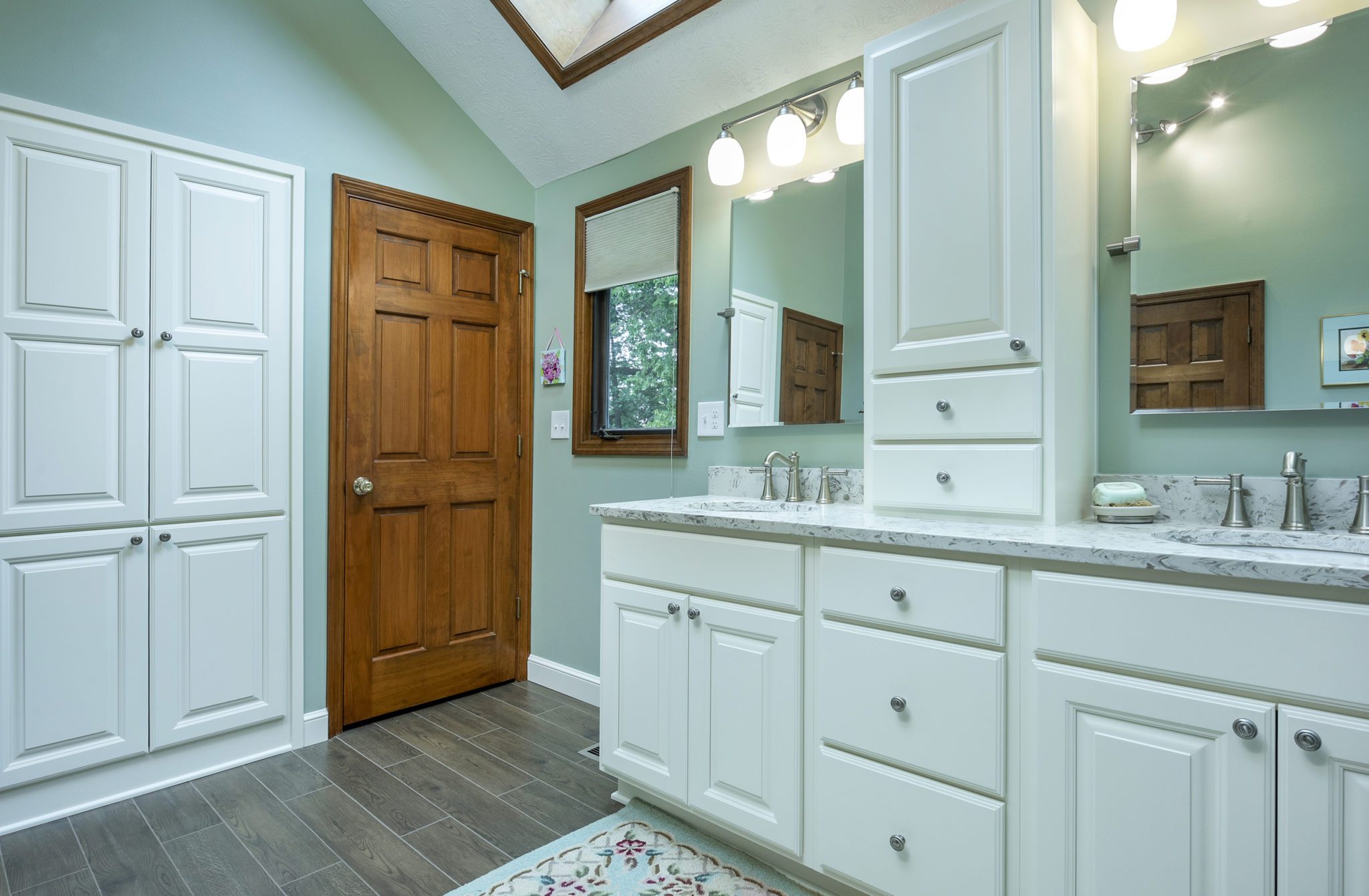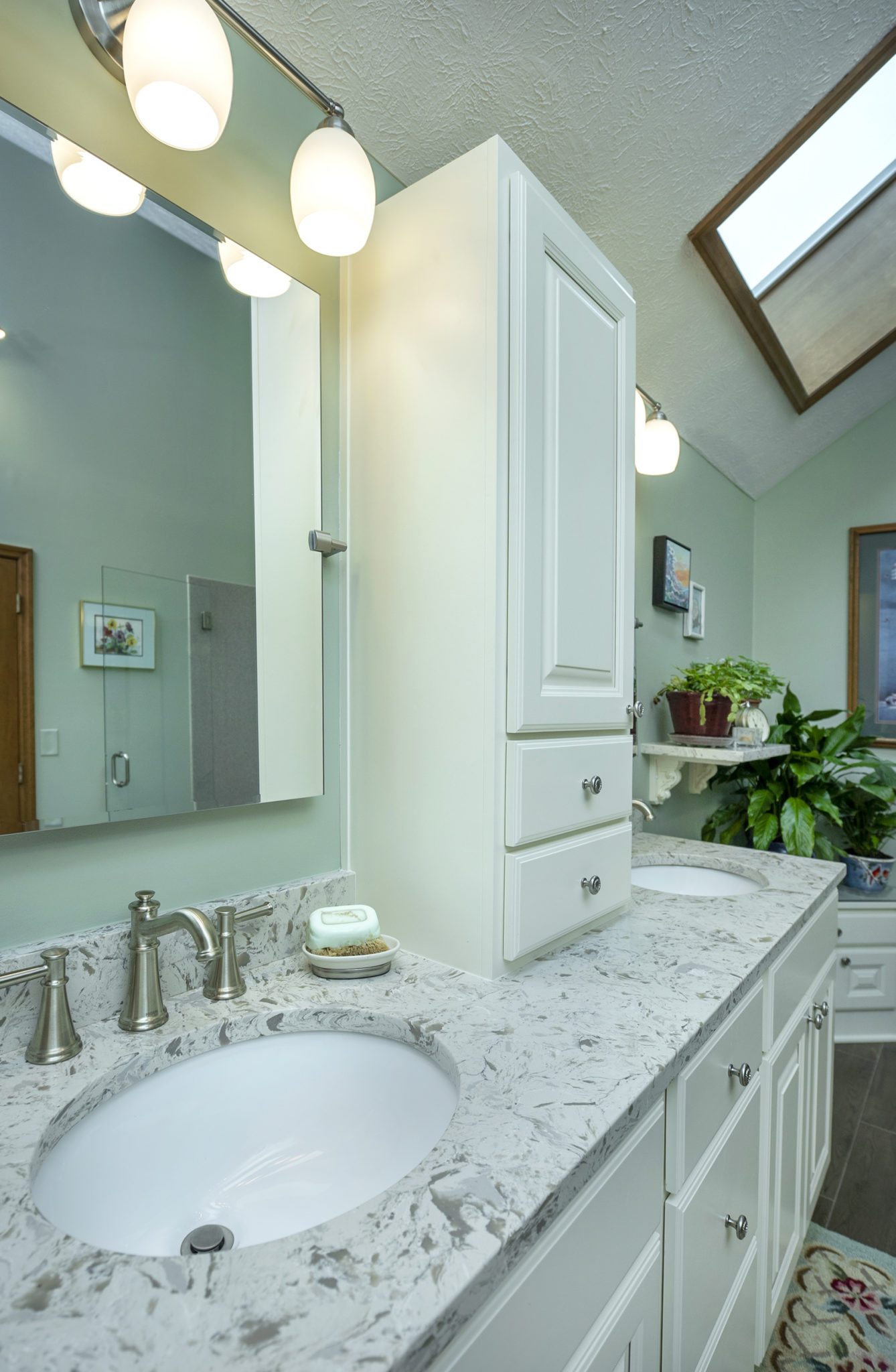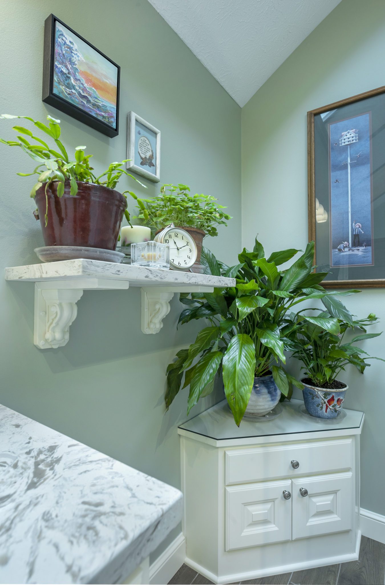 Storage was further optimized with the addition of a countertop linen cabinet, allowing the homeowners to showcase the elegant quartz countertop. To enhance both functionality and aesthetics, a matching quartz plant ledge and decorative corbels were introduced, alongside a cozy corner bench for display and additional storage.