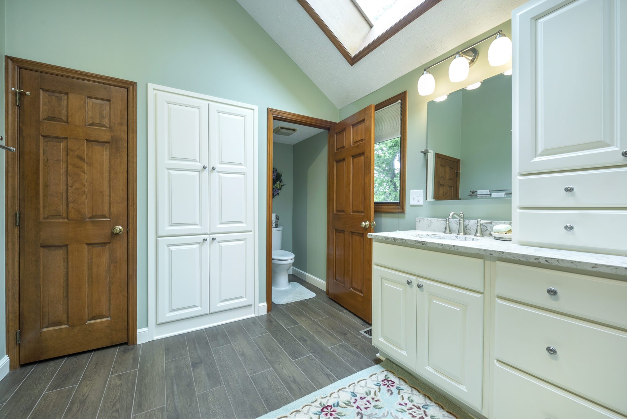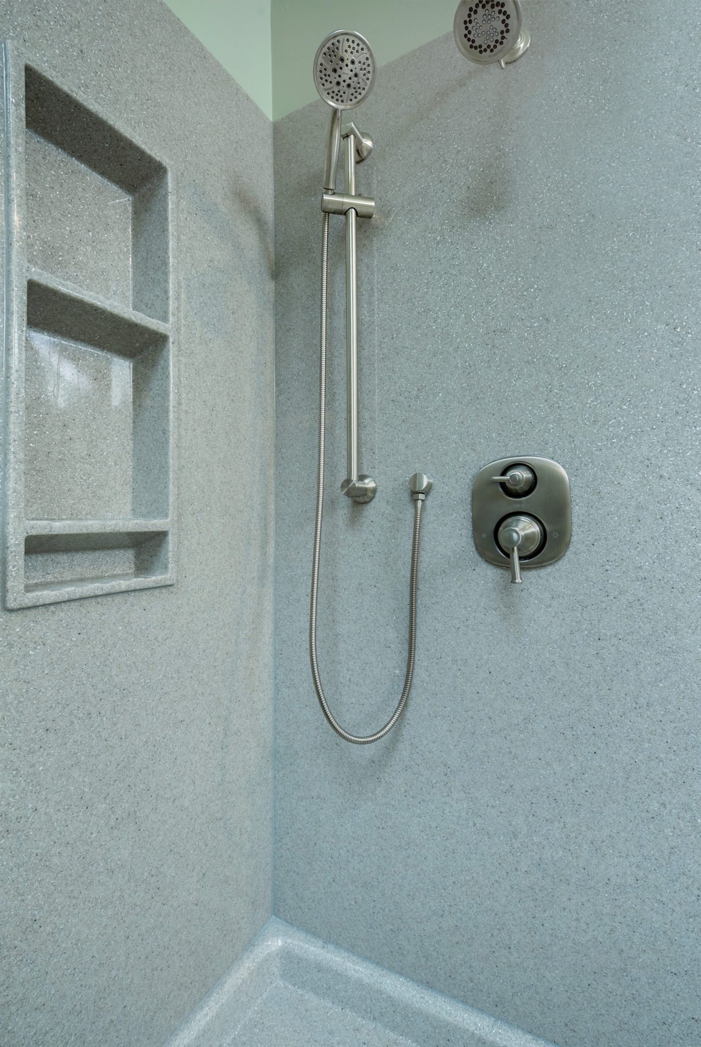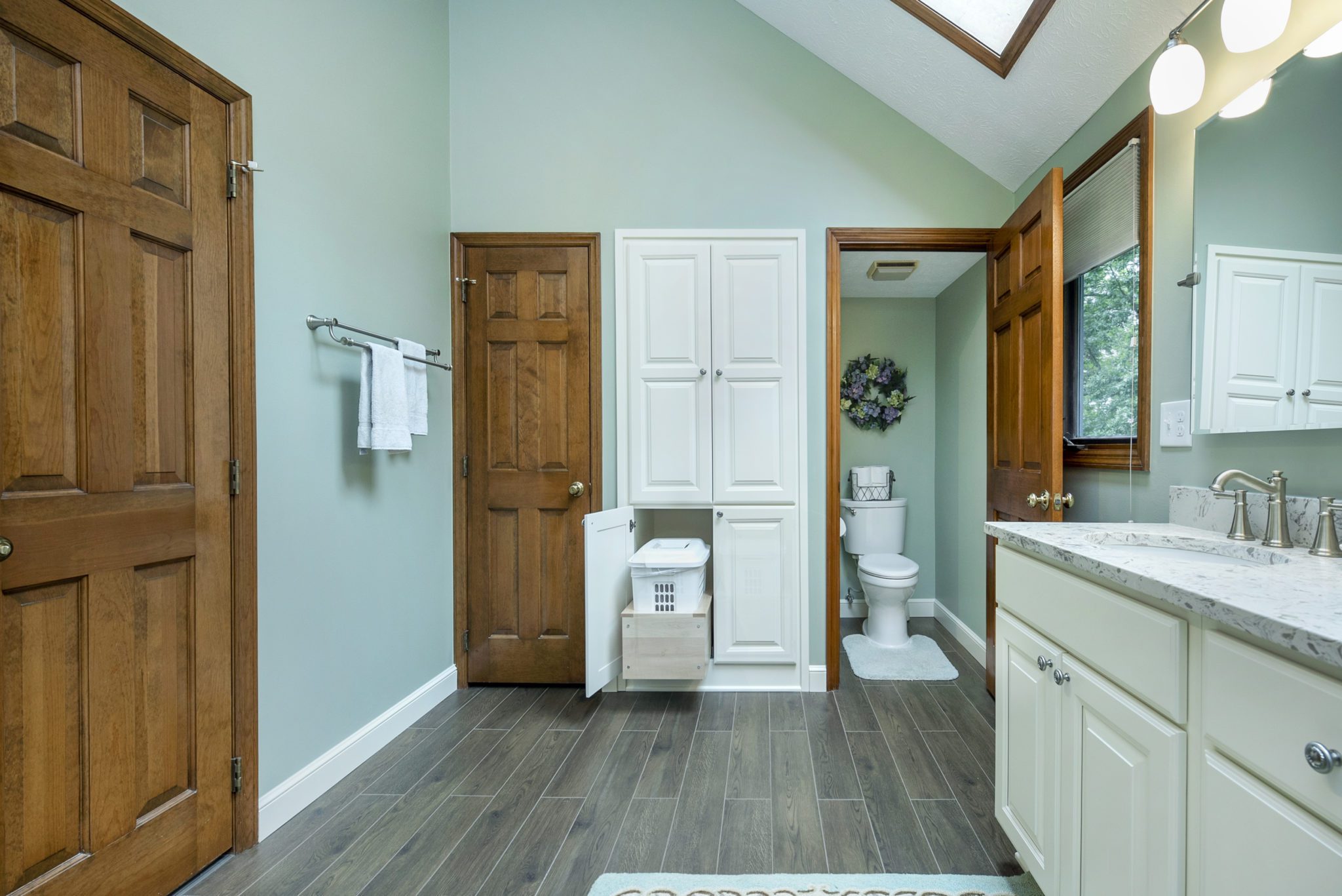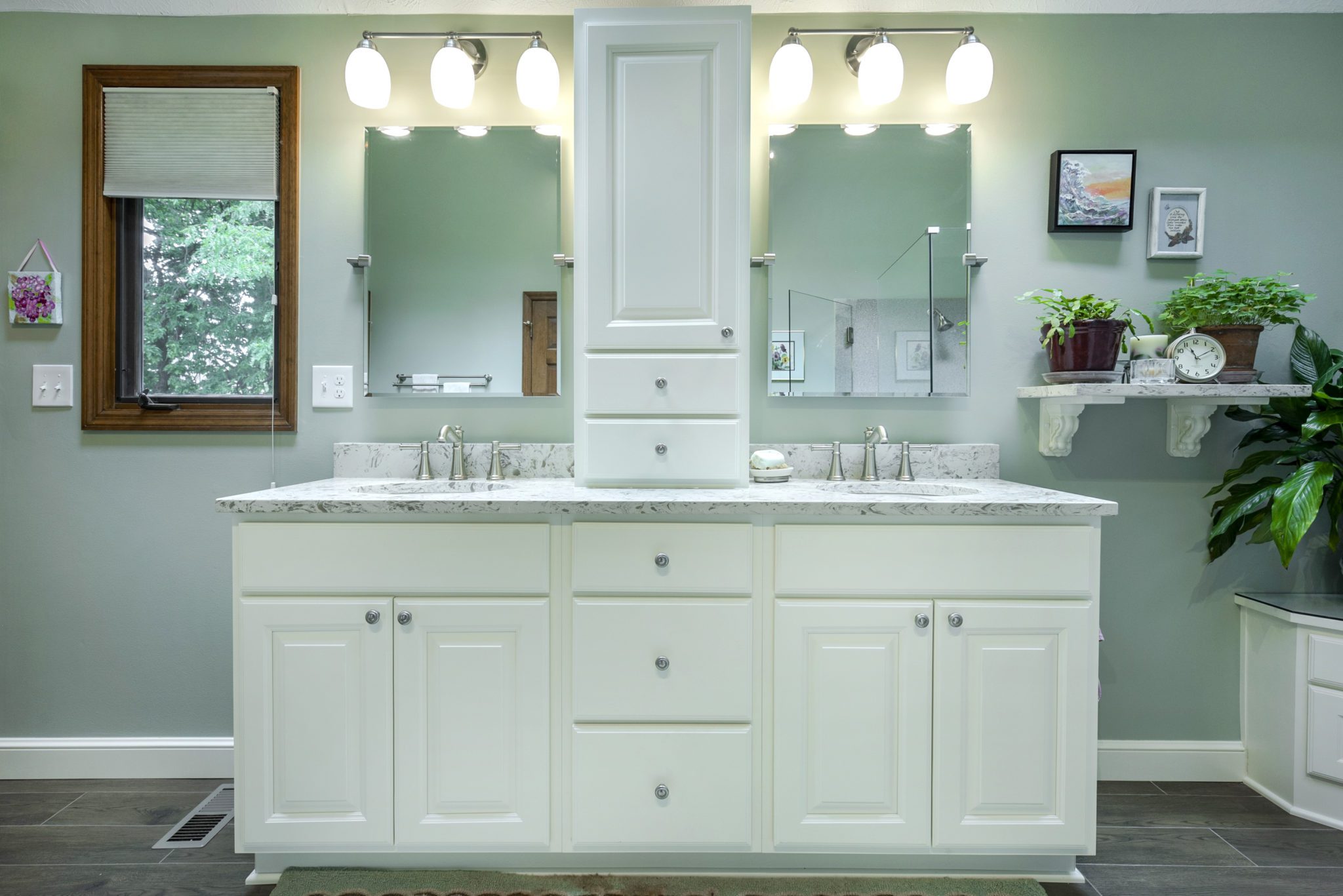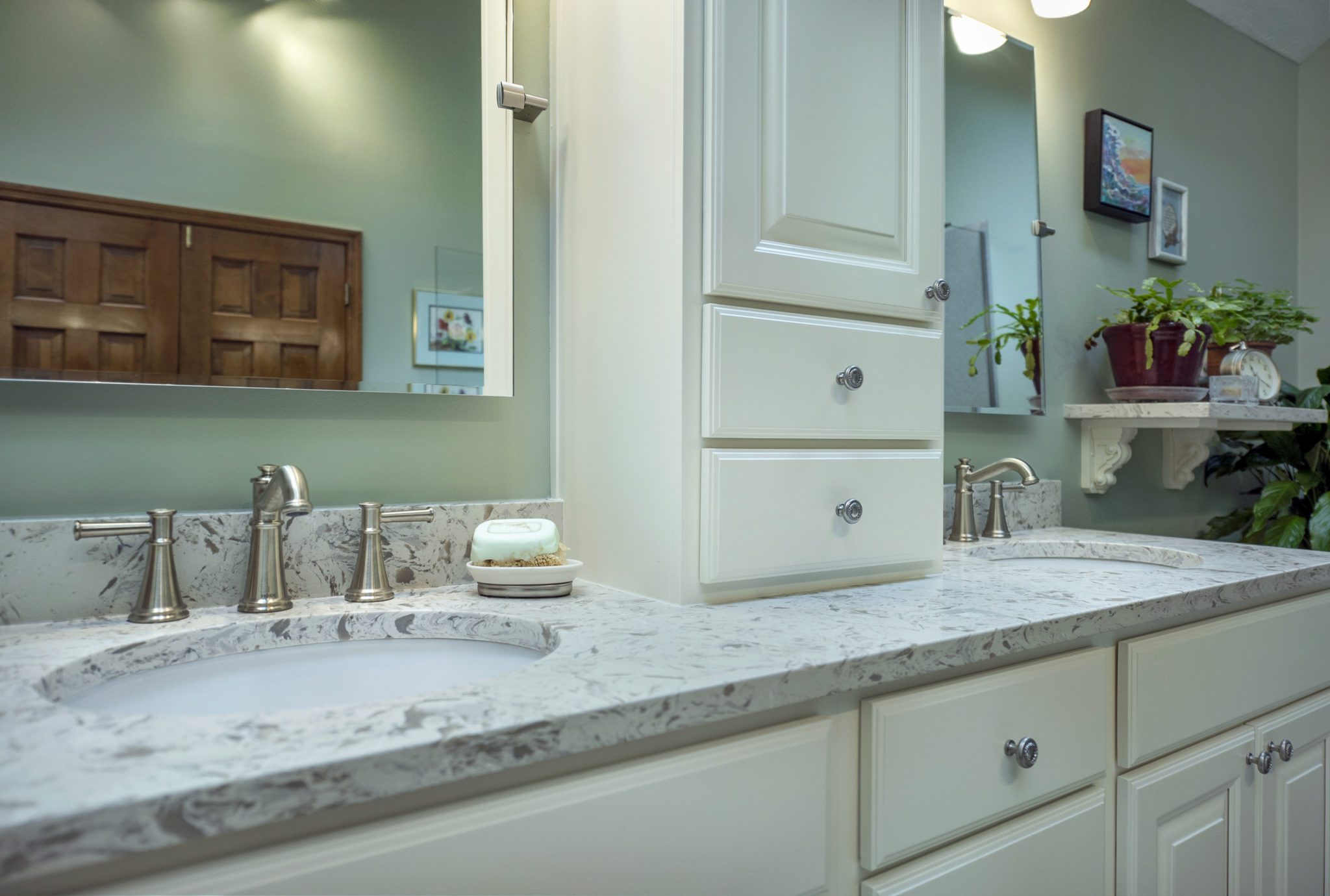 Storage was further optimized with the addition of a countertop linen cabinet, allowing the homeowners to showcase the elegant quartz countertop. To enhance both functionality and aesthetics, a matching quartz plant ledge and decorative corbels were introduced, alongside a cozy corner bench for display and additional storage.