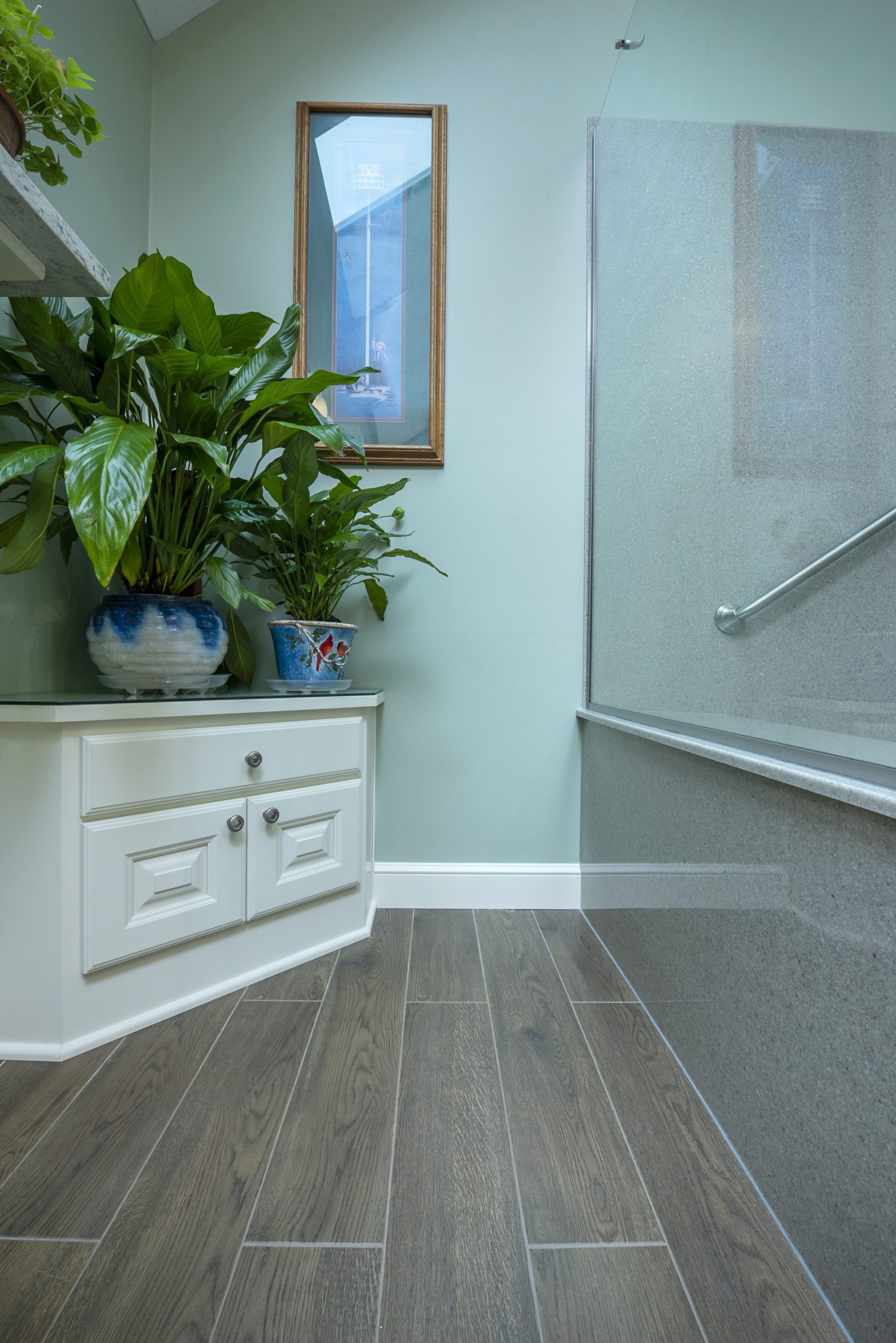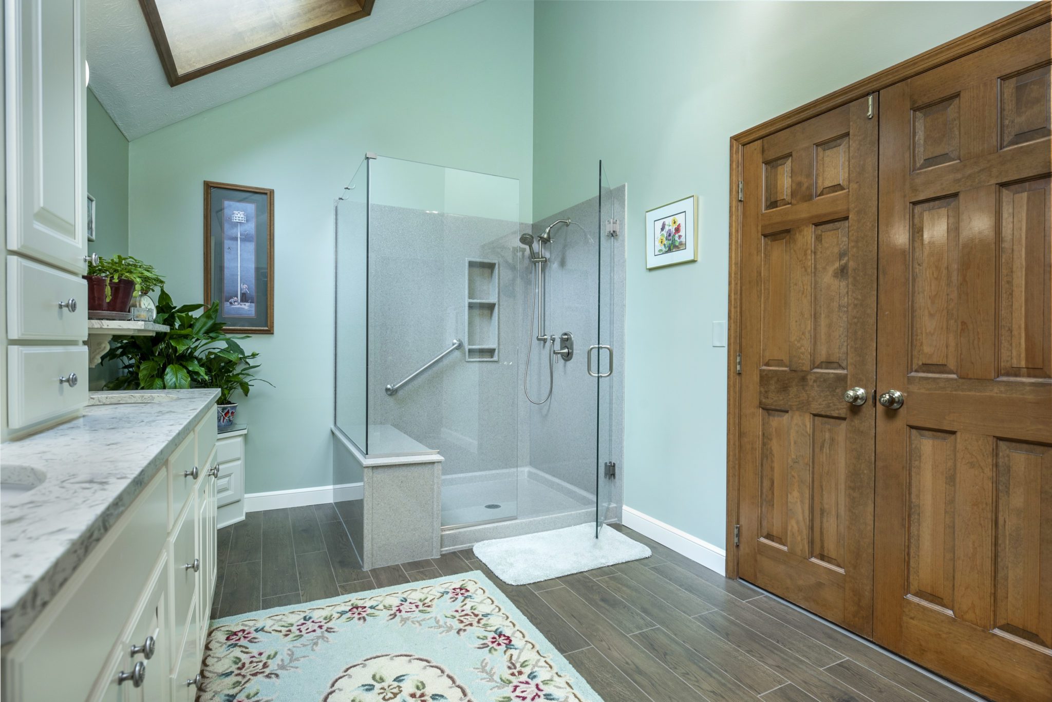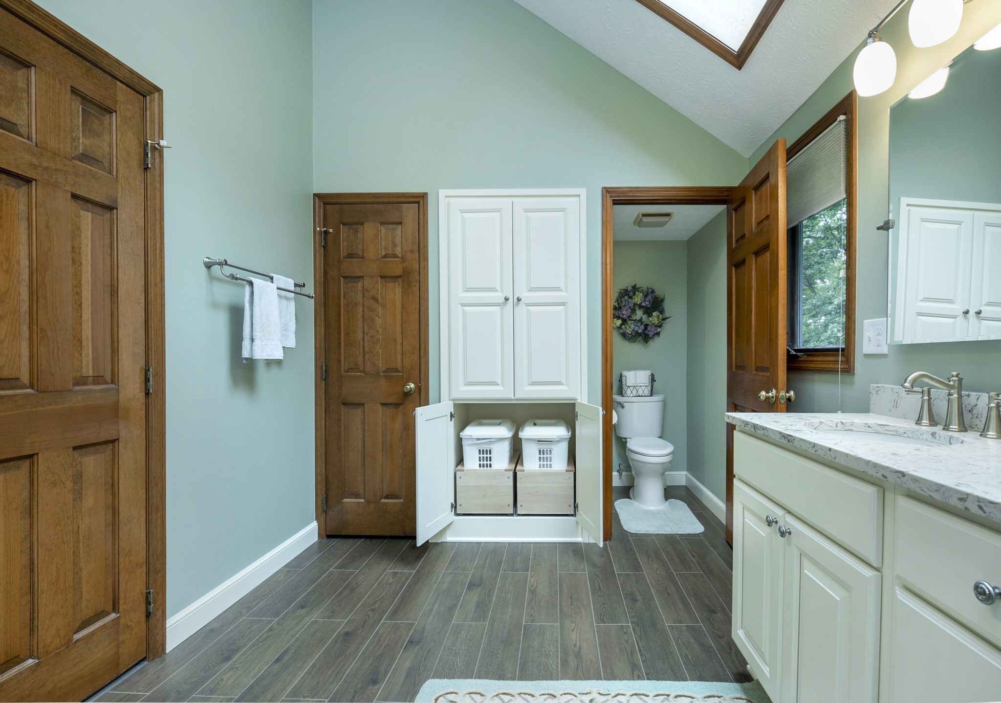 With our team, the outdated features were swiftly revamped. The cramped shower gave way to a cleverly designed linen cabinet, complete with slide-out hampers for organization. Meanwhile, the unused tub area blossomed into a luxurious walk-in shower, boasting a comfortable bench and sleek frameless doors—all within a quick turnaround.